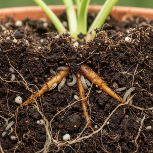 • Flétrissement ou croissance réduite : Les larves consomment les racines fines, nuisant à l’absorption de l’eau et des nutriments. Les plants peuvent paraître faibles, rabougris ou flétris.