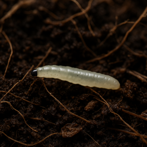 • Larves visibles dans le sol : En cas de forte infestation, les larves translucides à tête noire peuvent être observées à la surface du substrat, surtout lorsque celui-ci est trop humide ou perturbé.
